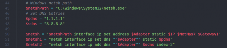 $netsh1 = “$netshPath interface ip set dnsserver $Adapter static $pdns”
